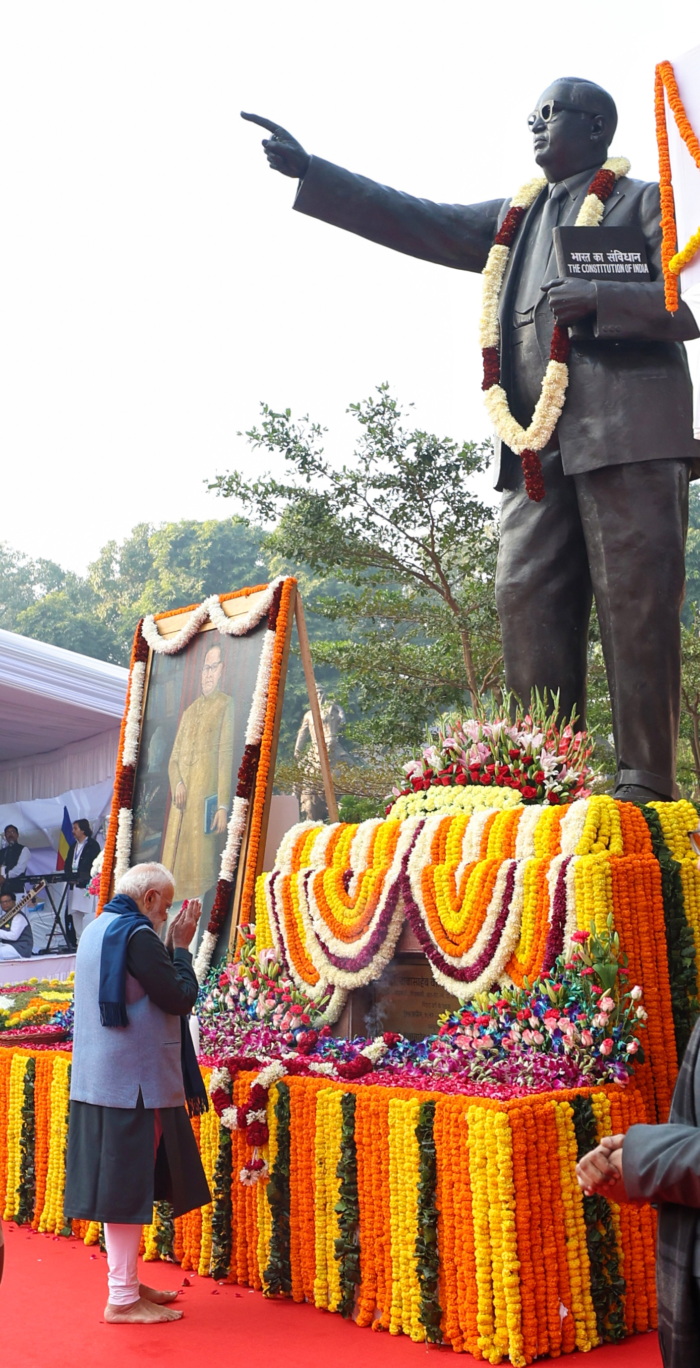PM pays floral tributes to Dr. Babasaheb Ambedkar on his Mahaparinirvan Diwas at Parliament House, ...
