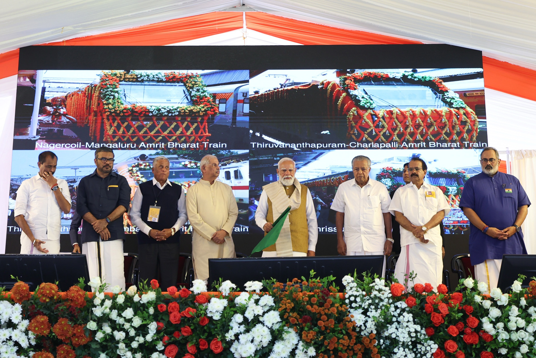 In a major boost to rail connectivity, Prime Minister flagged off four new train services, including three Amrit Bharat Express trains and one passenger train. These include the Nagercoil-Mangaluru Amrit Bharat Express, Thiruvananthapuram-Tambaram Amrit Bharat Express, Thiruvananthapuram-Charlapalli Amrit Bharat Express, and a new passenger train between Thrissur and Guruvayur. The introduction of these services will significantly enhance long-distance and regional connectivity between Kerala, Tamil Nadu, Karnataka, Telangana and Andhra Pradesh, making travel more affordable, safe and time-bound for passengers. The improved connectivity will provide a strong impetus to tourism, trade, education, employment and cultural exchange across the region.