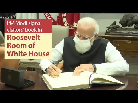 వైట్ హౌస్ రూజ్వెల్ట్ రూమ్లో సందర్శకుల పుస్తకంలో సంతకం చేసిన ప్రధాని